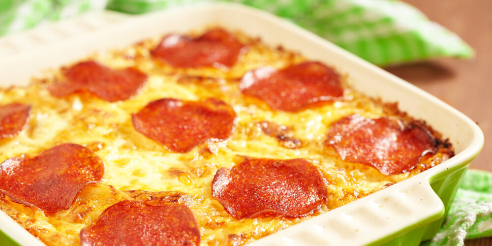 Liec krēmīgo masu cepamtraukā un nolīdzini virsu. Cep aptuveni 15 minūtes, līdz mērce uzburbuļojusi un sacepumam ir brūnas maliņas. Pasniedzot pārkaisi ar zaļumiem.