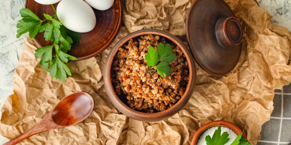 Sajauc griķus ar 2 olām, masu izklāj uz cepamplāts un uzsildītā cepeškrāsnī izkaltē.