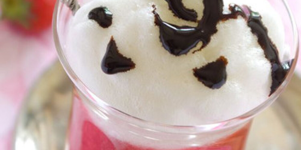 Kad krējuma masa sāks želēties, viņai piejaukt klāt vispirms saldo krējumu, pēc tam olu baltumus. Zemenes sasmalcināt blenderī ar 2 ēd.k pūdercukura un salikt trauciņos. Pa virsu salikt debesmannas bumbiņas un dekorēt to visu ar šokolādes sīrupu vai arī ar izkausētu ūdens peldē šokolādi.