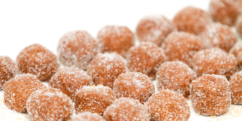Ar tējkaroti izveido apmēram 30 vienāda izmēra bumbiņas, tās apviļā pūdercukurā. Uzglabā ledusskapī.