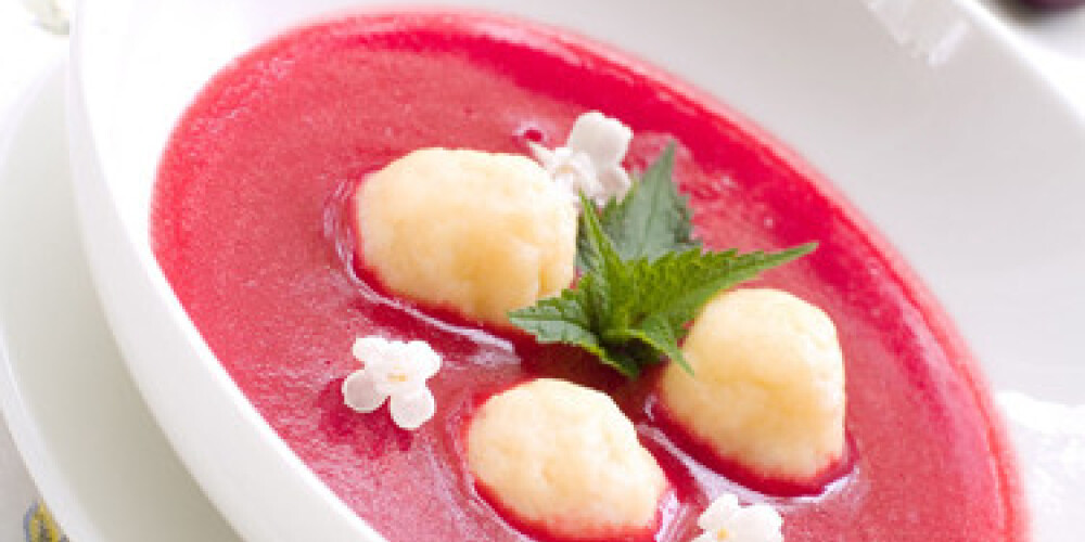 Katrā šķīvī ieliek pāris biezpiena bumbiņas un pārlej ar zupu.