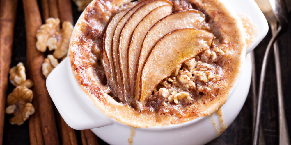 Ieberzē sviestu miltos, iemaisi cukuru un riekstus, līdz izveidojas drumstalas. Pārkaisi augļus ar iegūtajām drumstalām un cep 180 grādos 30 minūtes līdz virspuse apbrūnējusi.