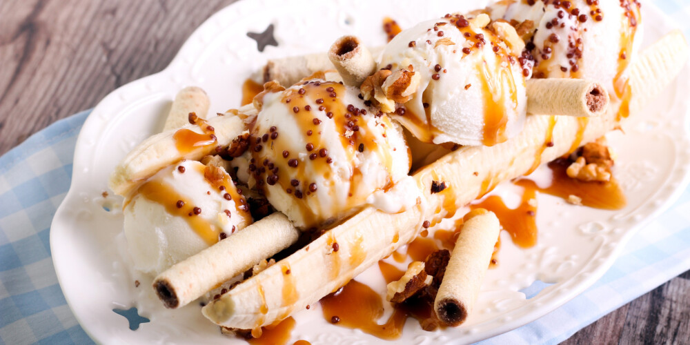 Saputo krējumu ar cukuru. Pārgriez banānus šķērsām un liec uz diviem deserta šķīvjiem. Katrai porcijai pa vidu banānu pusītēm liec divas bumbiņas saldējuma. Uzliec skaistu putukrējuma cepurīti, pārlej ar mērci un pārkaisi ar riekstiem.