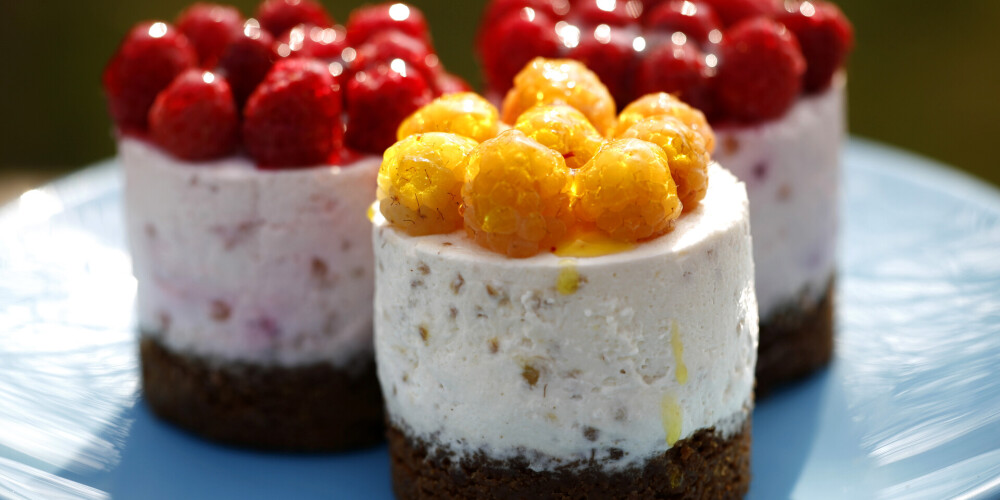 Uzmanīgi novieto cilindrus ar visām pamatnītēm uz gluda paliktņa. Liec krēmu cilindros, nogludini virsmu. Kūkas ar visu paliktni ievieto ledusskapī vismaz uz 1 stundu, lai krēms sastingst.