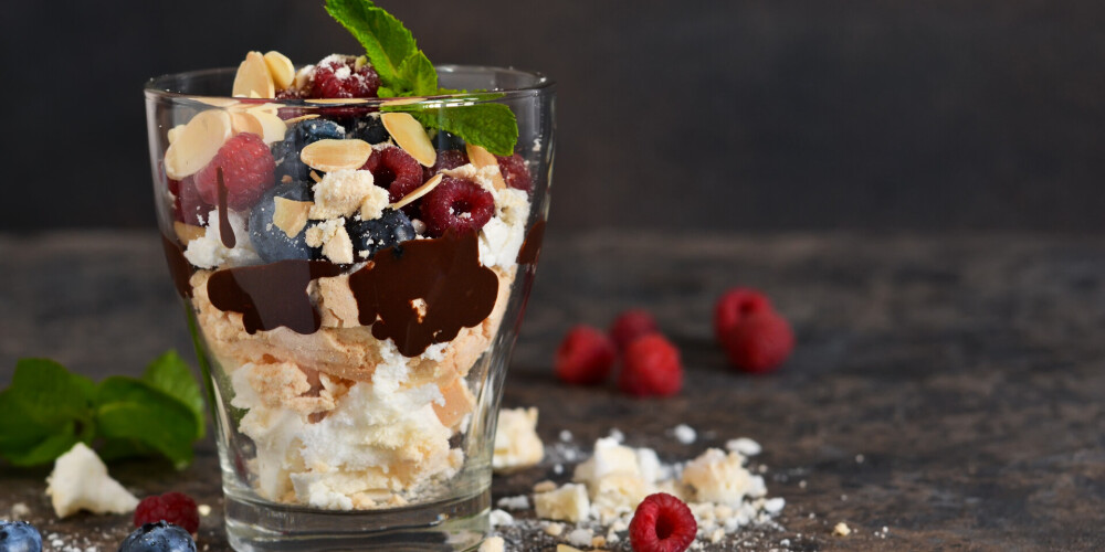 Biskvīta gabaliņus kārto deserta traukā, liec virsū avenes un pārlej ar piena mērci. Ievieto ledusskapī uz 3–4 stundām.