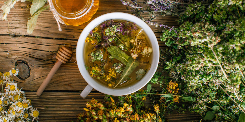 Zaļumus, ziedus un citrona daiviņas ber katlā, aplej ar ūdeni, uzvāri un uz lēnas uguns turpini vārīt 5–7 minūtes.