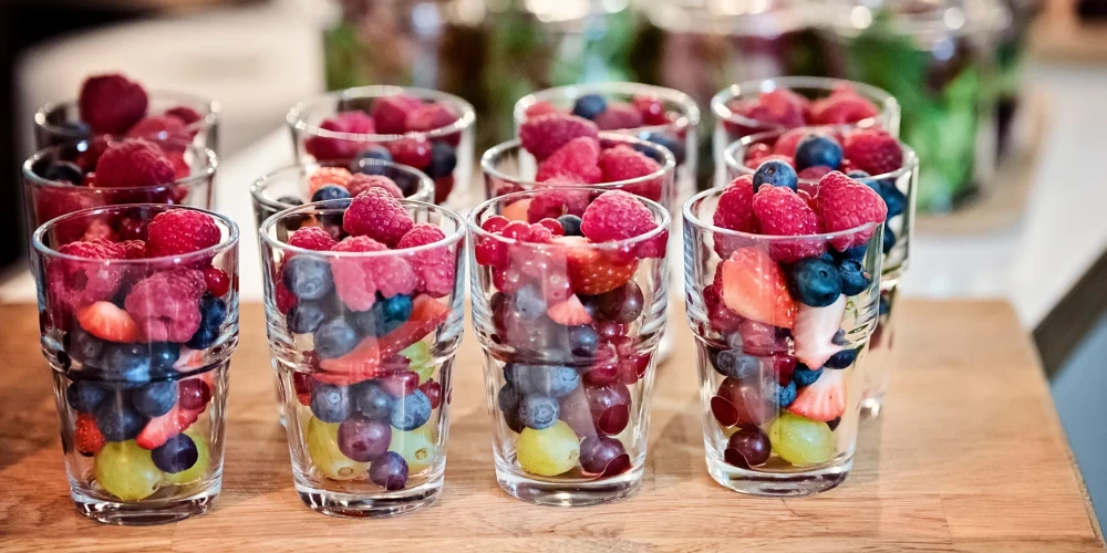 Liec šo želatīna substanci aukstajā bļodā, pievieno atlikušo dzirkstošo vīnu, lēni maisi, lai nav putu. Liec atpakaļ ledusskapī uz 1 stundu, līdz želeja sāk stingt un tad tajā iecilā ogas. Liec atpakaļ ledusskapī visu bļodu vai sadali saturu pa porciju trauciņiem un tad liec ledusskapī uz vairākām stundām, lai želeja sacietē. Gatavai tai jābūt stingrai, bet ar burbuļainu struktūru.