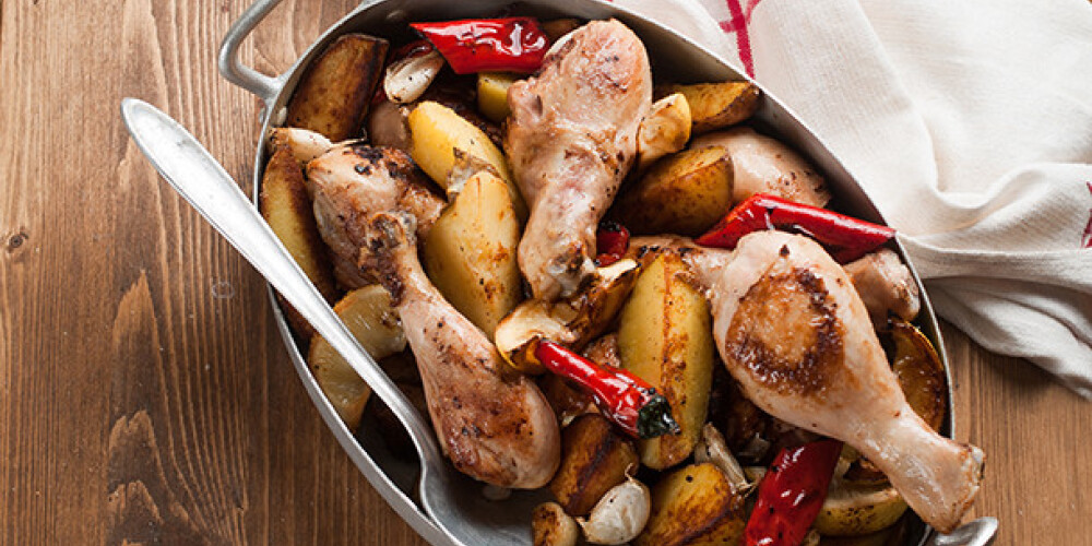 Karstumizturīgā formā pārliek stilbiņus, kartupeļus, ķiplokus, rozmarīnu, citronus, pārkaisa ar sāli un svaigi maltiem pipariem, pārle ar olīveļļu un apmaisa. Cep iepriekš uzkarsētā cepeškrāsnī 180 grādos apm. 1 stundu, ik pa brīdim apmaisot.