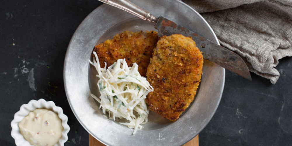 Karbonādes pasniedz ar mērci un selerijas salātiem.