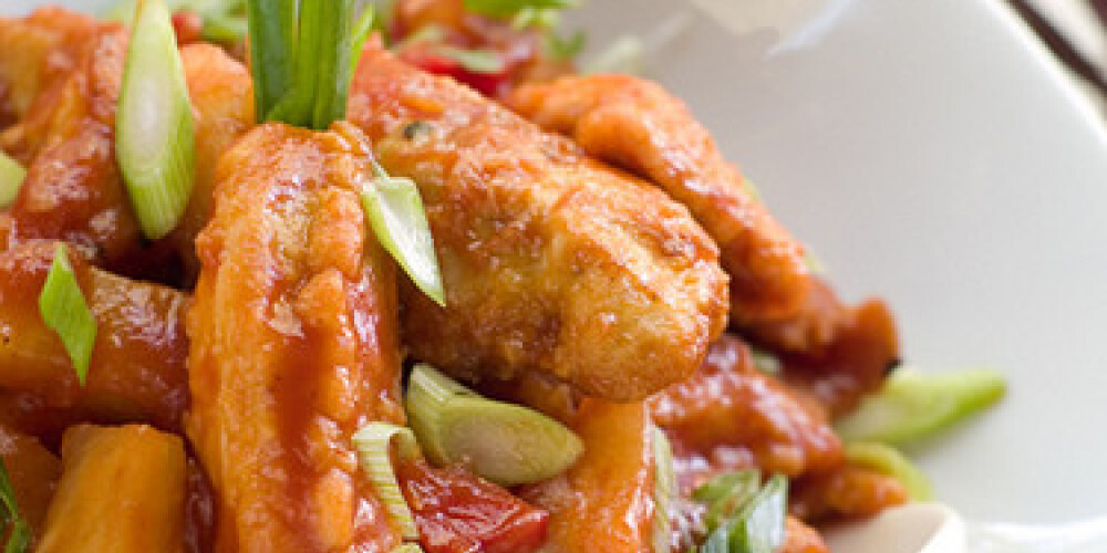 Sakuļ olas, pievieno kartupeļu cieti, miltus, sojas mērci un garšvielas. Sagriež vistu mazos gabaliņos, apviļā mīklā un liek cepties sakarsētā eļļā, līdz tā kļūst zeltaini brūna. Izcepto vistu izliek uz papīra salvetes, lai notek liekā eļļa.Katlā lej Mildas Ķīnas saldskābo mērci, pievieno kubiņos sagrieztu papriku un ananāsus. Ja mērce liekas par biezu, pievieno nedaudz ūdens. Vāra, līdz paprika kļūst mīksta. Pievieno mērcei iebiezinātu kartupeļu cieti. Pēc tam pievieno apcepto vistu un visu kārtīgi samaisot pasautē.