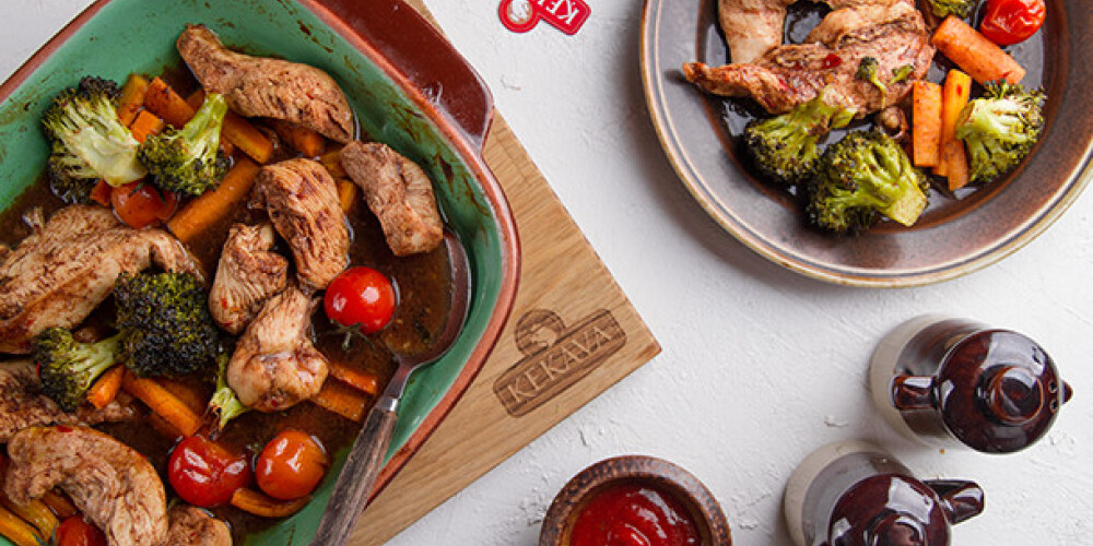 Pa šo laiku gatavo dārzeņus. Burkānus notira un sagriež palielos gabalos. Brokoli sadala ziedos. Karstumizturīgā formā liek burkānus, brokoļus un tomātus, pārlej ar olīveļļu, pārkaisa ar ķiploku pulveri, sāli un svaigi maltiem pipariem pēc garšas un cep cepeškrāsnī apm. 15 min. Tad pievieno cāļa fileu un cep līdz gaļa ir gatava, apm. 30 min.