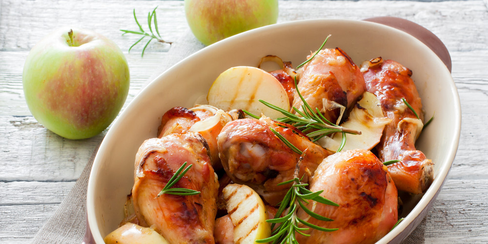Sīpolus un ķiplokus nomizo un sakapā. Vistas fileju noskalo, nosusini un sagriez plānās strēmelēs. Banānus un ābolus nomizo, banānus sagriez ripiņās, ābolus – nelielos gabalos.
