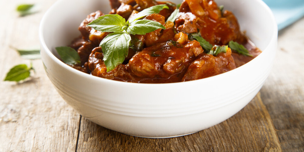Lielā katlā ielej olīveļļu, cep sīpolu un ķiploku 5 minūtes, līdz tie zeltaini un mazliet mīksti. Ieber katlā liellopa gaļas strēmelītes, piparus, tomātus un rozmarīnu un visu uzvāri.