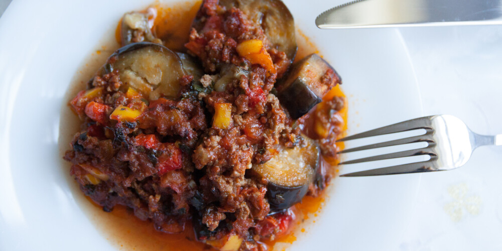 Gaļu samaisi ar apceptajiem baklažāniem. Pasniedz ar rīsiem.