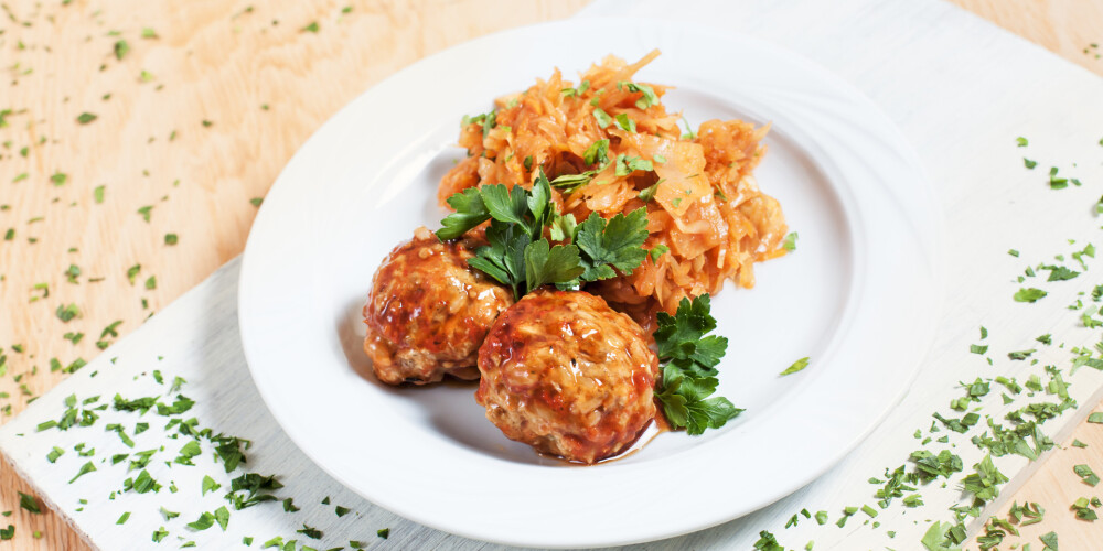 Pievieno kāpostus, frikadeles, lauru lapas un kadiķogas. Pielej 750 ml ūdens, pieber sāli un piparus un, ik pa laikam apmaisot, sautē kādas 50 minūtes. Pārkaisi ar majorānu.