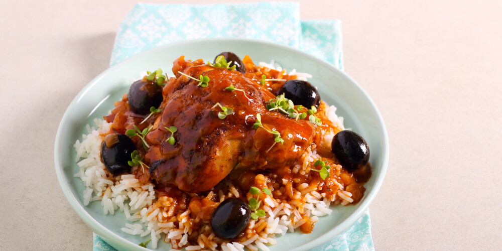 Uz pannas liec sīpolu, ķiploku, čili, rozmarīnu un apcep 7 minūtes. Tad pievieno vīnu, tomātus un vistas gaļu. Pasautē 10 minūtes. Pievieno sāli un piparus pēc garšas. Pārkaisi ar olīvām.