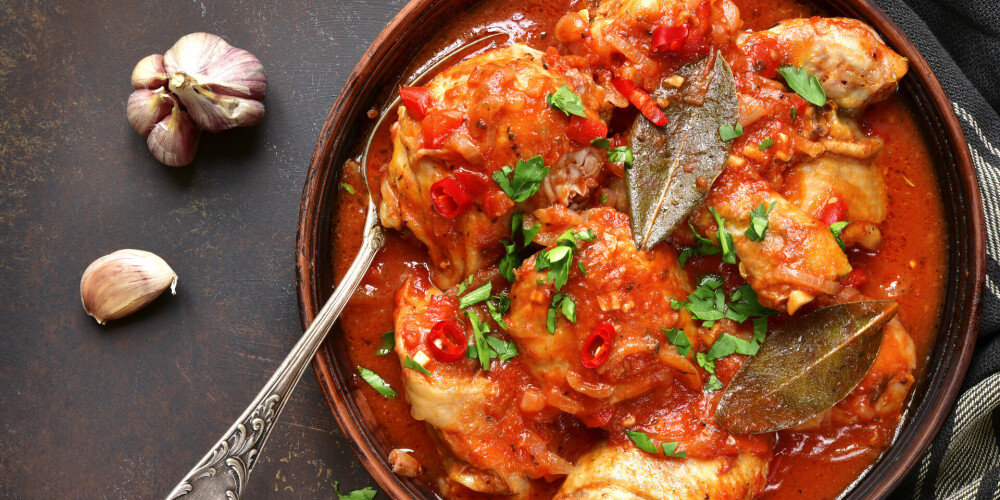 Pannā apcep vistas gabaliņus no abām pusēm zeltainus. Liec cepamajā traukā un pārlej ar sagatavoto mērci. Cep 25-30 minūtes, līdz gaļa kļūst mīksta. Pirms pasniegšanas pārkaisi ar atlikušo baziliku.