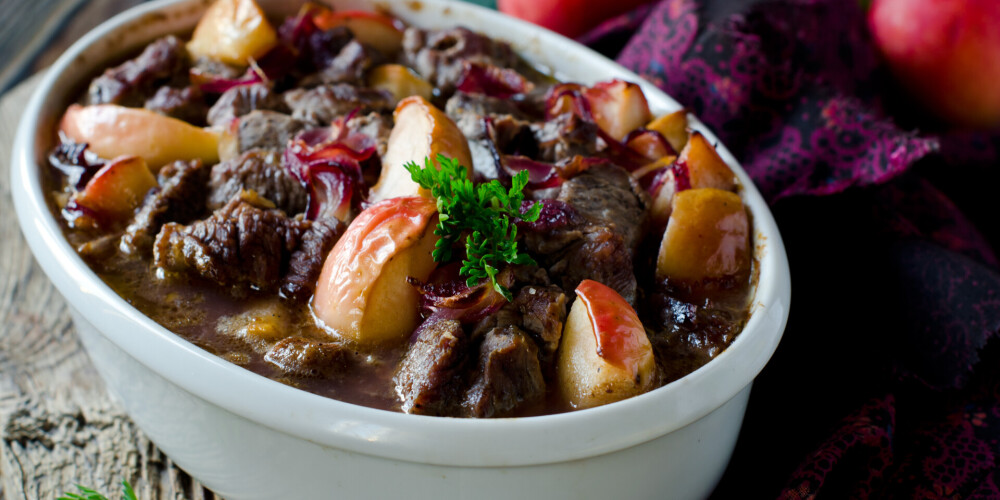 Sautē uz vidējas liesmas, līdz gaļa mīksta un āboli izšķīduši. Tad gaļu no mērces izņem, mērci izkāš caur sietiņu.