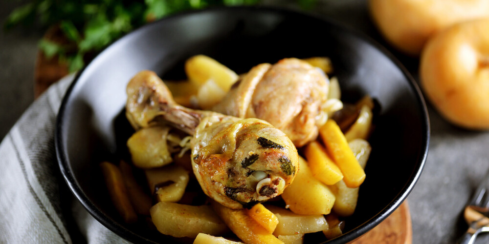 Liec lielos šķīvjos ceptos kāļus ar burkāniem, virsū kārto vistas strēmelītes, izrotā ar pētersīļu lapiņām.