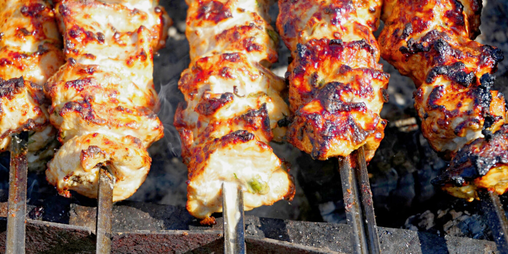 Vistas gabalus uzdur uz iesmiem un notīri zaļumus un sīpolus. Liec uz oglēm un cep gatavus.