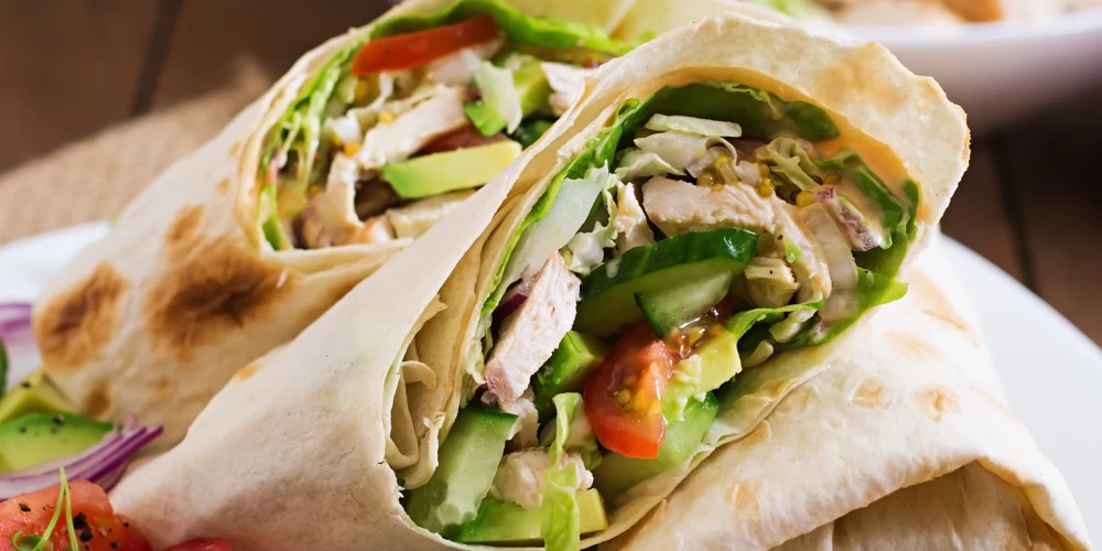Tortiljas plāceni apsmērē ar pesto, liec virsū vistu, pusīti sagriezta avokado un rukolu. Apslaki ar laima sulu.