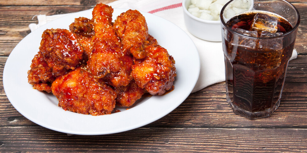 Vistas spārniņus liek lielā bļodā, pārkaisa ar sāli un pipariem un pārlej ar kolu. Trauku apsedz ar vāku vai pārtikas plēvi un liek vismaz uz 2 stundām marinēties (ieteicams uz visu nakti).