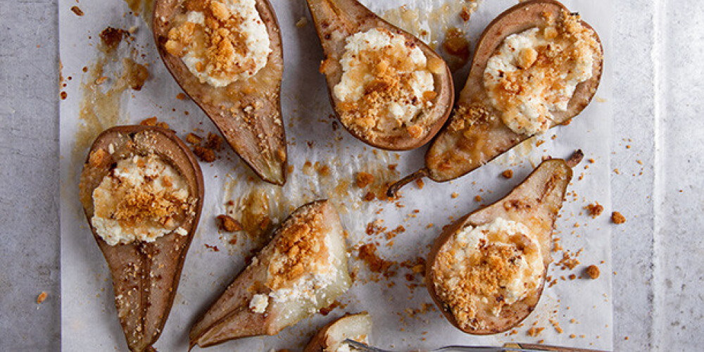 Bumbierus nomazgā, sagriez uz pusēm un izgreb vidu. Bumbierus pārliec uz cepešpannas un katru pusīti piepildi ar biezpiena masu. Katru pusīti pārkaisi ar kanēli. Cep cepeškrāsnī apmēram 15 minūtes. Tad bumbierus pārkaisi ar sasmalcinātiem cepumiem un cep vēl 15 minūtes.