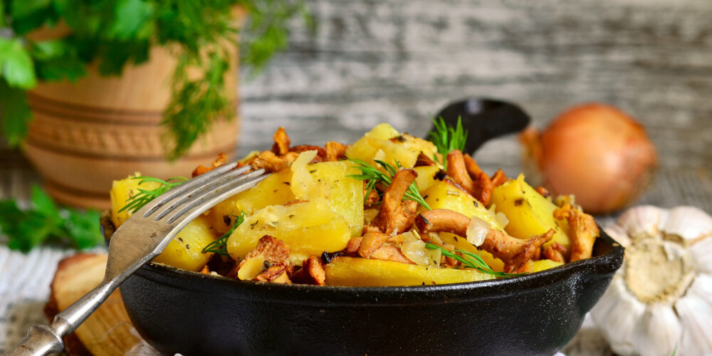 Lej pannā mazliet eļļas un tajā apcep gailenes – līdz izgarojis ūdens un tās sāk viegli brūnēties. Ber pannā kartupeļus, pievieno saplucinātu lapu kāpostu, pasāli, sapiparo, samaisi un pāris minūšu ļauj cepties. Tad iesit olas, uzliec vāku un turpini cept vēl 2–3 minūtes. Pārkaisi ar rīvētu sieru un nekavējoties pasniedz.