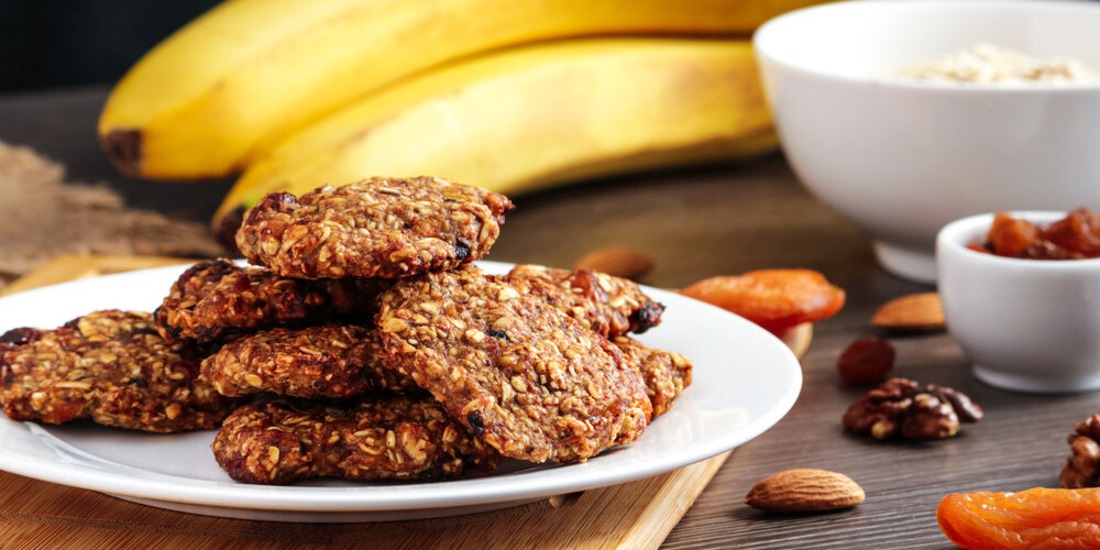 Banānus ar dakšiņu samīci un samaisi ar cukuru. Pievieno auzu pārslas, rozīnes un riekstus un samaisi.