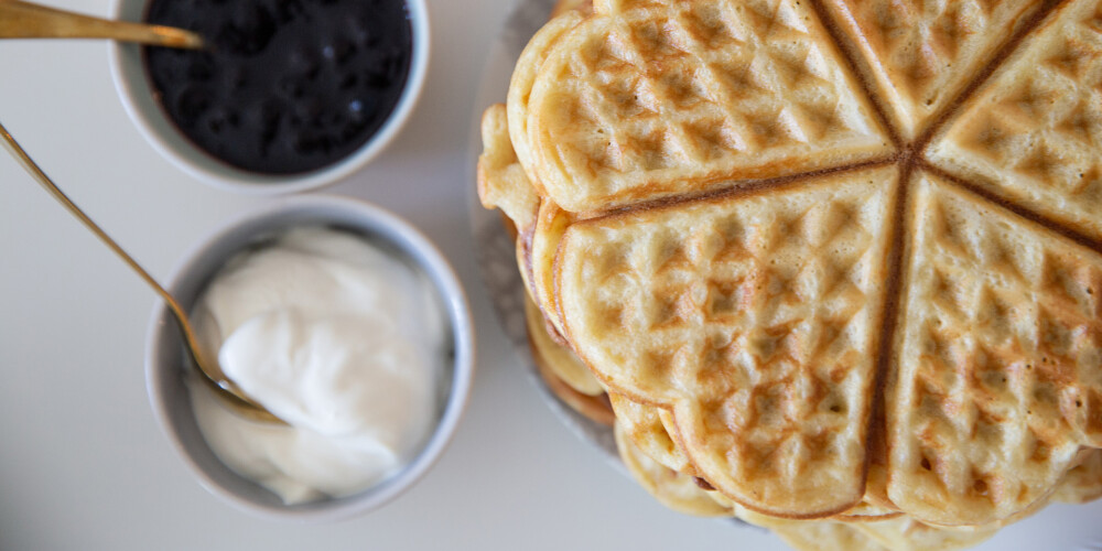 Vafeļu pannu vai veidni iezied ar eļļu un cep vafeles zeltaini dzeltenas.