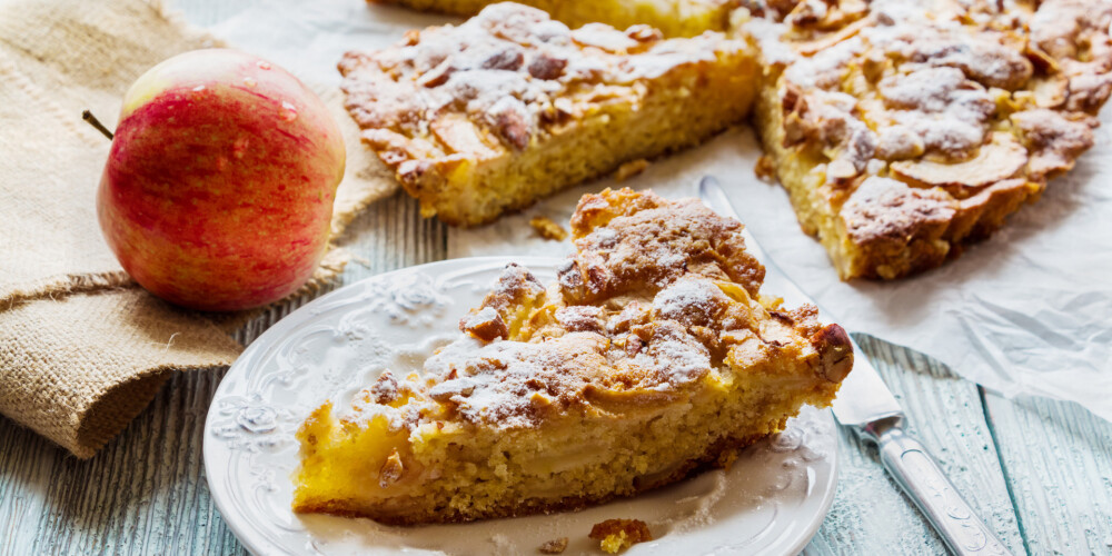 Lielā bļodā atlikušo cukuru sajauc ar miltiem, cepamo pulveri, vaniļas ekstraktu, olām un sviestu. Pievieno pusi ābolu.