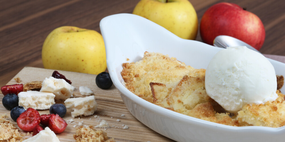 Uzkarsē cepeškrāsni līdz 180 grādiem. Ābolus nomizo, izņem serdes, sagriez šķēlītēs, pārkaisi ar cukuru un maltu kanēli pēc gaumes un patikšanas. Liec ābolus karstumizturīgā traukā, tiem pa virsu uzklāj skābo krējumu un uzber drupačas. Cep 15 minūtes. Pasniedz ar saldējuma bumbu.