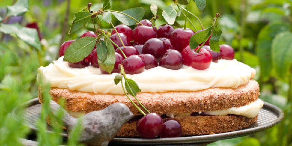 Vienu biskvīta daļu apsmērē ar ķiršu ievārījumu un izklāj mazliet mazāk par pusi no siera masas. Apsedz ar otru biskvīta daļu un pa virsu izkārto atlikušo siera masu.