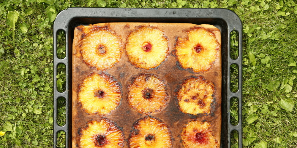 Uzkarsē cepeškrāsni līdz 180 grādiem. Izņem ķiršiem kauliņus. Uz sagatavotās plāts glīti kārto ananasa ripas, katrai vidū ieliekot ķirsi. Uzmanīgi pārlej mīklu un liec cepties, kamēr virspuse zeltaina. Tas varētu būt aptuveni 20 minūtes.