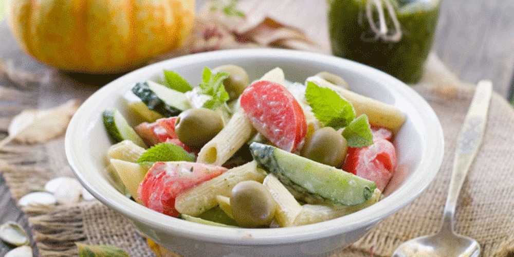 Lielā bļodā pesto sajauc ar jogurtu, pievieno makaronus, olīvas, tomātus un gurķus. Samaisa. Pēc garšas pievieno sāli un svaigi maltus piparus. Pasniedz uzreiz.
