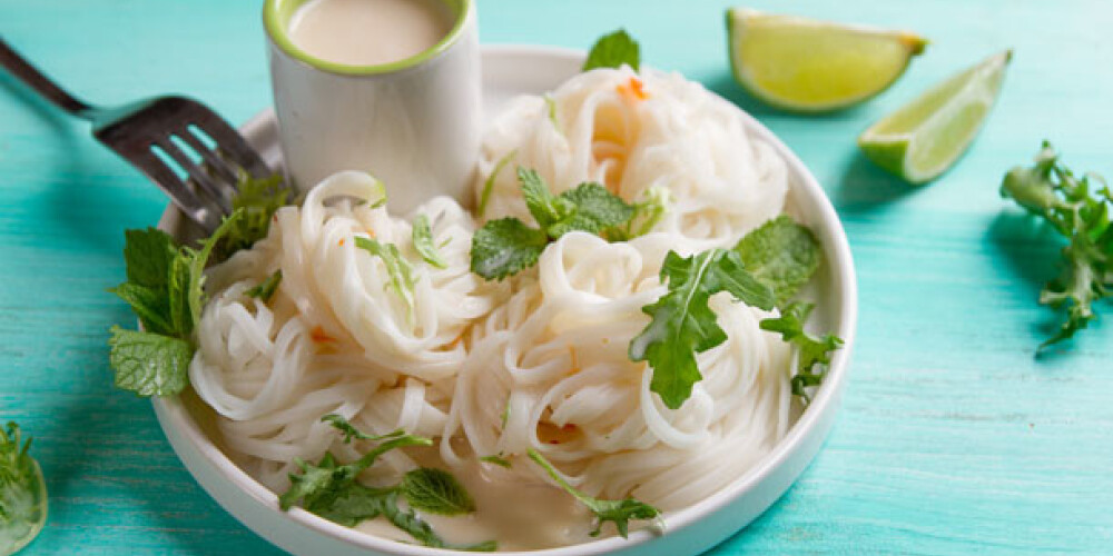 Rīsu nūdeles novāra atbilstoši instrukcijai uz iepakojuma. Ūdeni notecina, nūdeles noskalo zem auksta ūdens.
