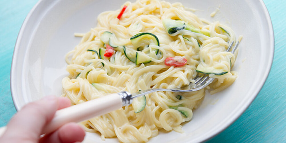 Cukini sagriež plānās strēmelītēs. Čili piparu sagriež smalkāk. Pannā uzkarsē eļļu un ātri apcep cukini un čili piparus.