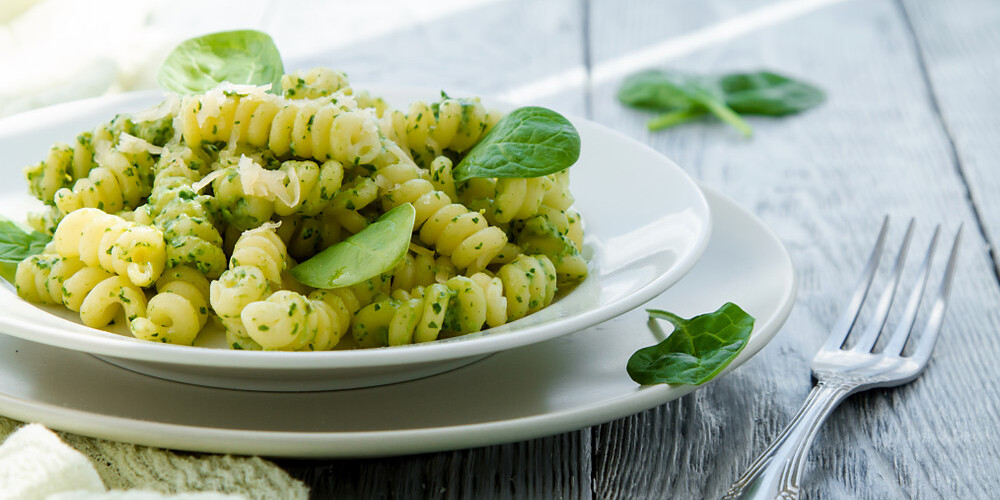 Rūpīgi nokās pastu, liec atpakaļ katlā un liec katlu uz mazas uguns. Pieliec pastai pagatavoto mērci, ciedru riekstus un atlikušos spinātus un maisot karsē, līdz spināti izskatās kā apvītuši. Pieber sāli un piparus, pārkaisi ar Parmas sieru un pasniedz.