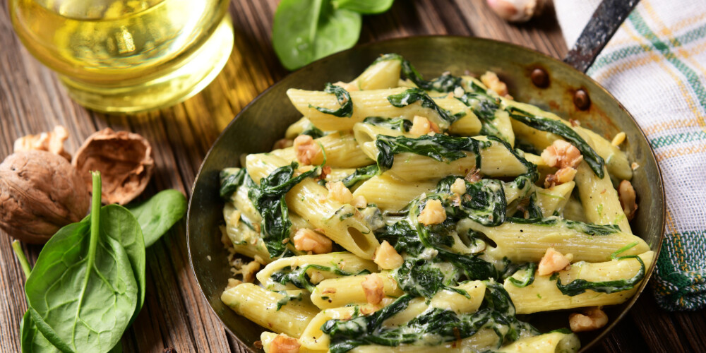 Mērcei pievieno novārītus makaronus. Ja mērce šķiet pa biezu, pievieno ūdeni no makaronu vārīšanas. Pašās beigās visu samaisi, pārkaisi ar riekstiem un parmezānu.