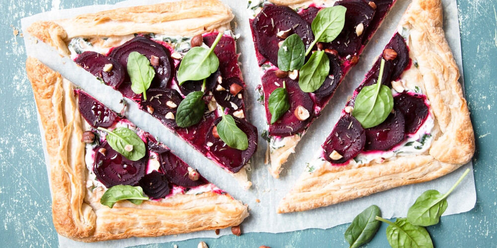 Mīklu apslaci ar Balzamiko etiķi. Bietes sagriezt plānās šķēlītēs un sakārto uz mīklas virsmas. Pa virsu sadrupini kazas sieru.