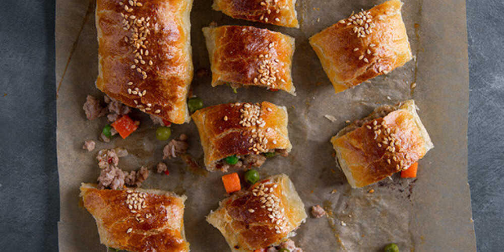 Katru plāksni izrullē un pa vidu uz katras mīklas plāksnes liek pildījumu. Tad malas sastirpina kopā un pārliek uz cepešpannas ar šuvi uz leju. Katru sagatavi apsmērē ar sakultu olu, pārkaisa ar sezama sēkliņām un cep cepeškrāsnī 200 grādos apm. 20 min.