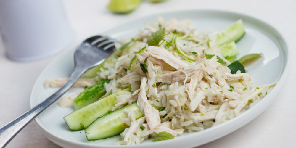 Rīsus sajauc ar kokosa mērci un vistas gaļu. Porcijas šķīvjos liek sagrieztu svaigu gurķi, pa virsu kārto salātus. Dekorē ar sasmalcinātu laima miziņu.