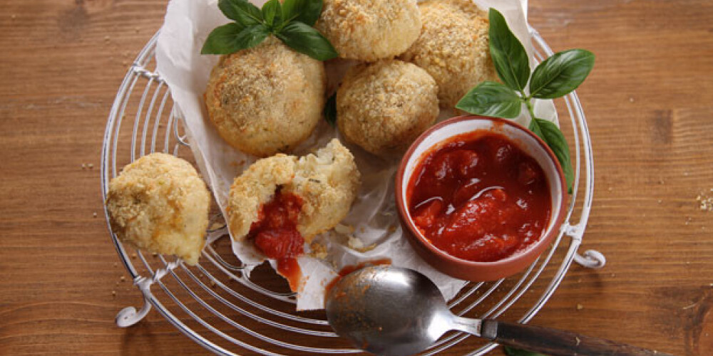 Bļodā ieber rīvmaizi. Atdzisušiem rīsiem pievieno olu dzeltenumu un kārtīgi apmaisa. Paņem rokā rīsu bumbiņu, iespiež iekšā mocarellas bumbiņu, aiztaisa caurumu un izviļā lielo bumbu rīvmaizē. Cep cepeškrāsnī 180 grādos uz 20 minūtēm
