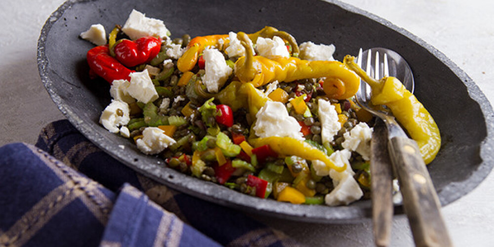 Lēcām pievieno papriku, seleriju, sīpolus, mērci un samaisa. Pa virsu kārto sadrupinātu sieru un asos piparus. Pasniedz uzreiz.