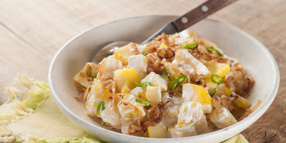 Krējumu sajauc ar sāli un svaigi spiestu citrona sulu. Kartupeļus sajauc ar ceptiem sīpoliem, pārlej ar mērci un uzmanīgi apmaisa.