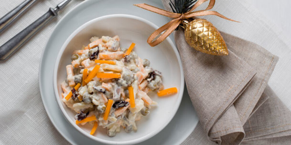 Sieru, vārītu gaļu un žāvētas plūmes sagriez stienīšos. Pievieno konservētus zirnīšus, krējumu, sinepes un visu kārtīgi samaisi. Pēc garšas pievieno sāli un svaigi maltus piparus.
