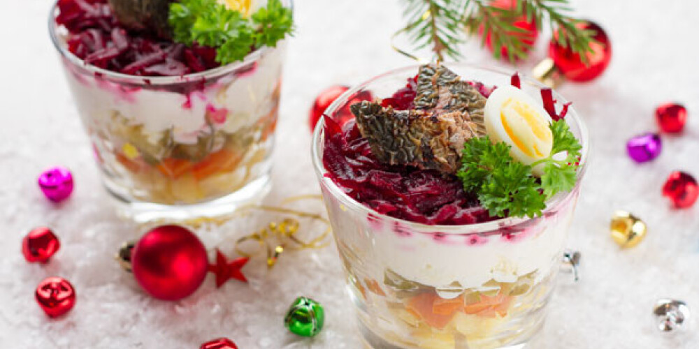 Četrus nēģus, gurķus, kartupeļus, burkānus sagriezt kubiņos. Bietes sarīvēt uz dārzeņu rīves. Mērcei etiķi sajaukt ar sinepēm un krējumu. Visas sastāvdaļas, izņemot bietes, kārto slāņos. Pēdējo slāni pārlej ar mērci un tad pa virsu kārto bietes.