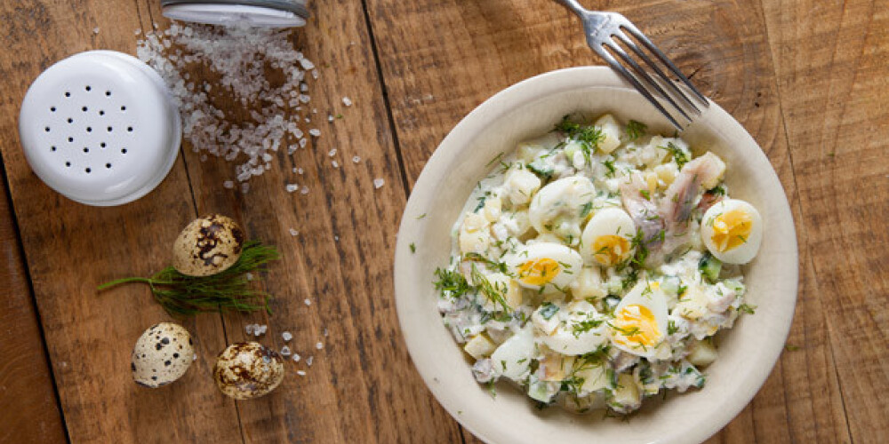 Kartupeļus nomizo, gurķus nomazgā un sagriež kubiņos. Siļķi sagriež tādos pašos kubiņos. Dārzeņus sajauc ar siļķi, pievieno biezpienu, krējumu, sasmalcinātus lokus un dilles. Pēc garšas pievieno sāli.
