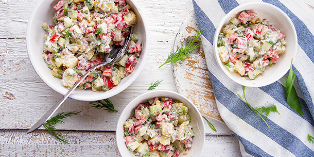 Pa šo laiku novārā ar mizu kartupeļus, atdzesē un nomizo. Kartupeļus sagriež kubiņos. Papriku sagriež uz pusēm, izņem sēklotni un arī sagriež kubiņos. Tādos pašos kubiņos sagriež arī selerijas kātus un mazsālītos gurķīšus. Sīpolu sagriež mazos kubiņos. Visus dārzeņus liek salātu bļodā.