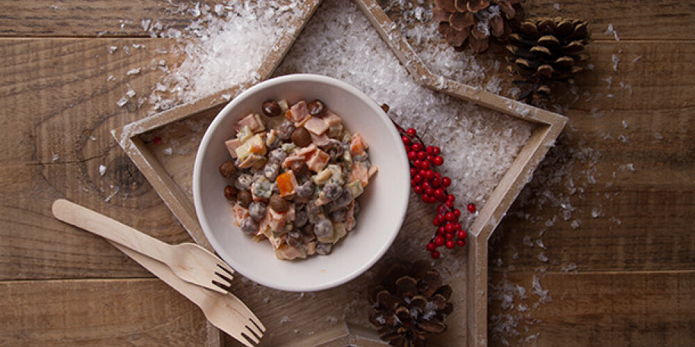 Gaļu, burkānus un marinētus gurķus sagriež vienāda izmēra kubiņos. Sīpolu nomizo un sagriež mazos kubiņos. Visu pārliek salātu bļodā.